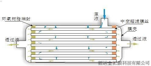 1、內壓式內壓式:即原液先進入中空絲內部,經壓力差驅動,沿徑向由內向外透過中空纖維成為透過液,濃縮液則留在中空纖維的內部,由另一端流出,其流向參見圖二所示。其中環(huán)氧樹脂端封的作用是在中空纖維膜絲的端頭密封住膜絲之間的間隙,從而使原液與透過液分離,防止原液不經過膜絲過濾而直接滲入到透過液中。其流向見圖二所示:
